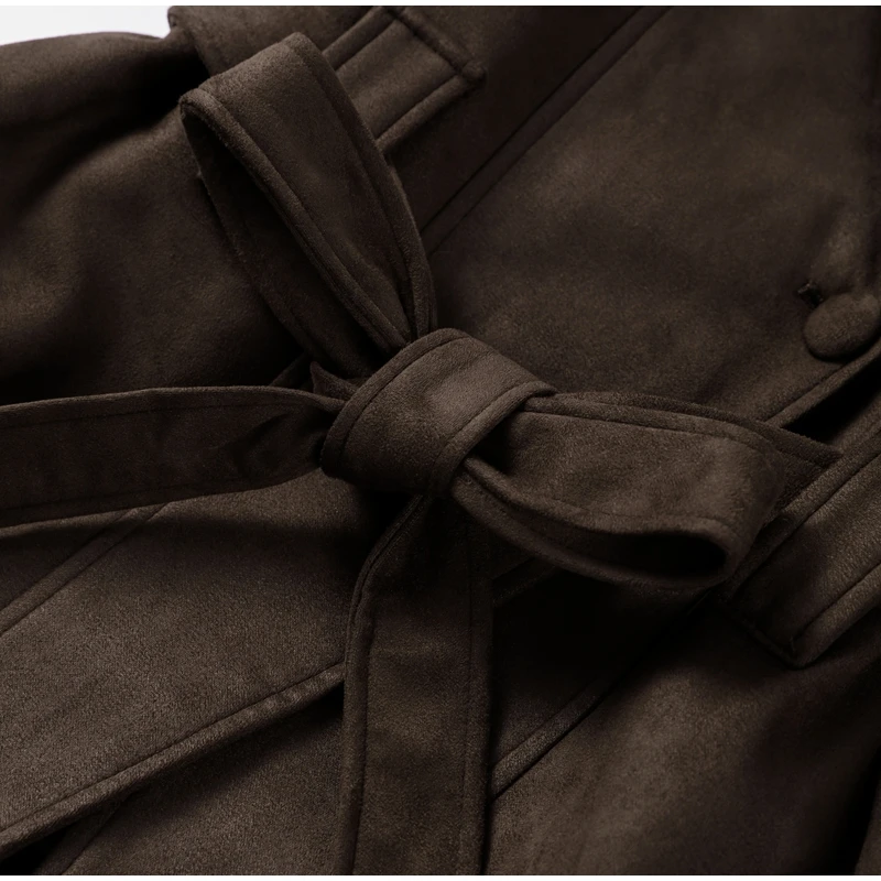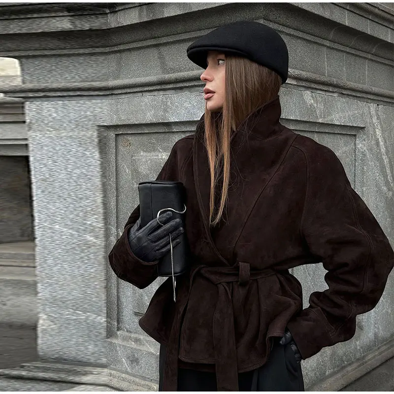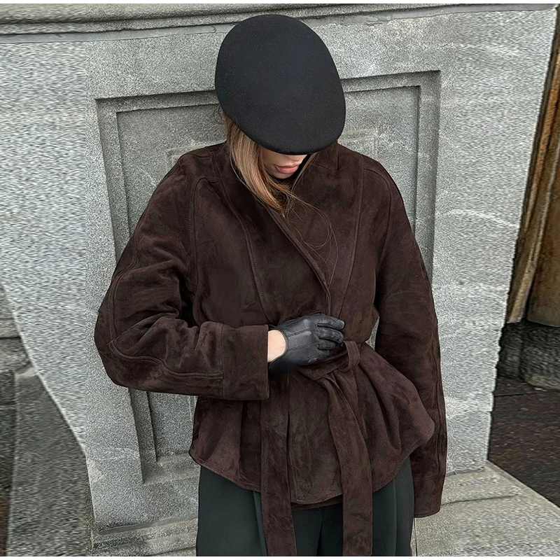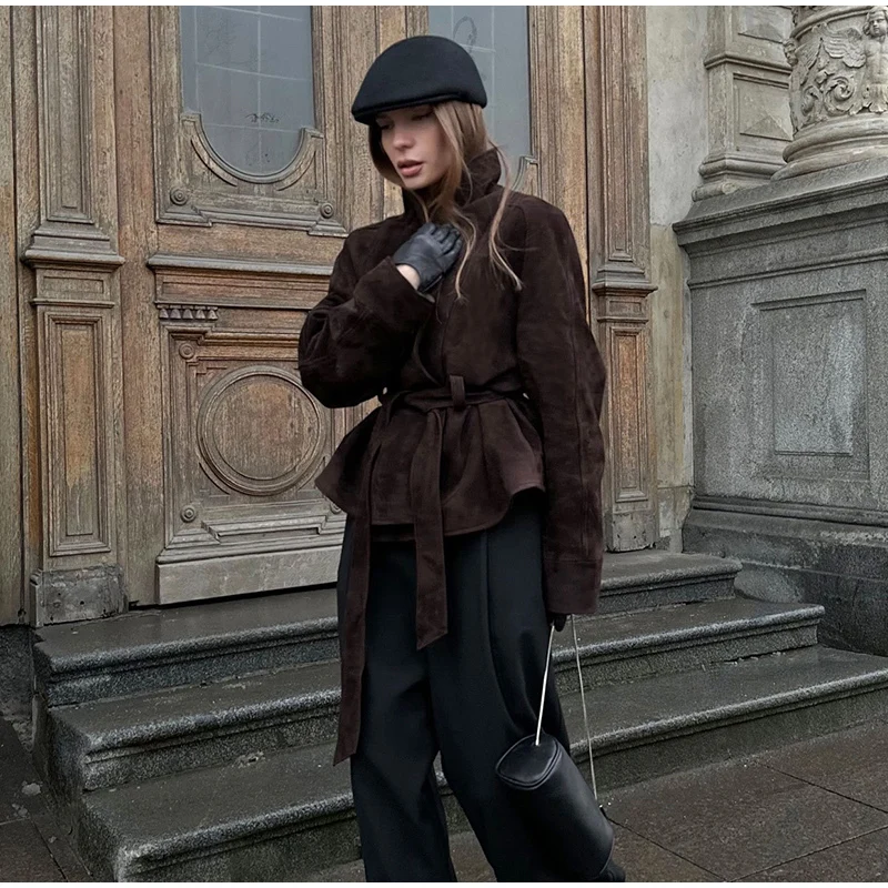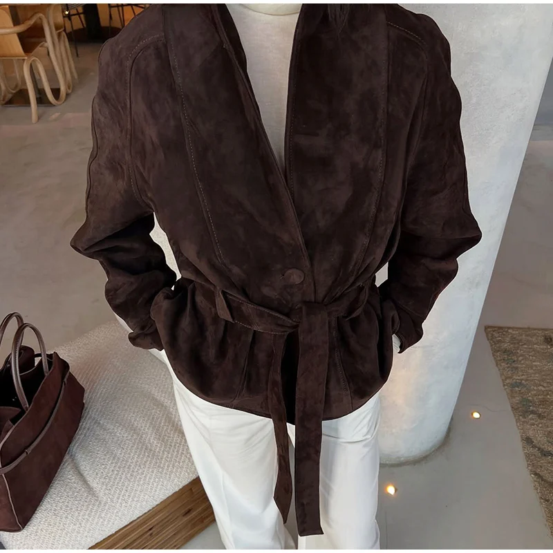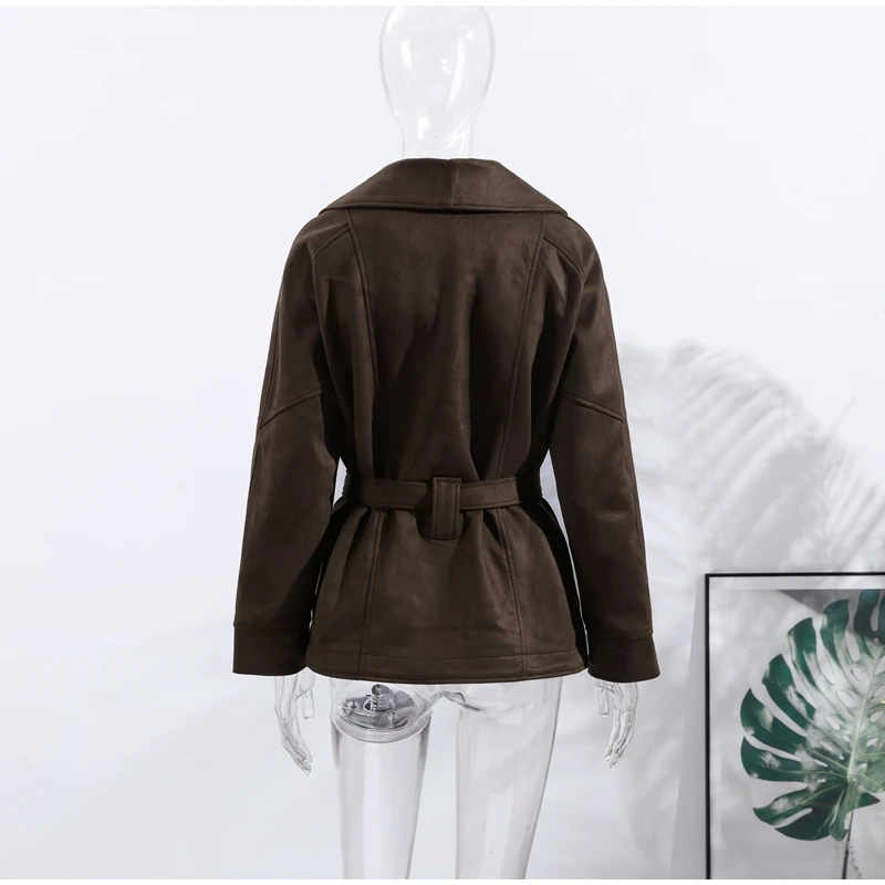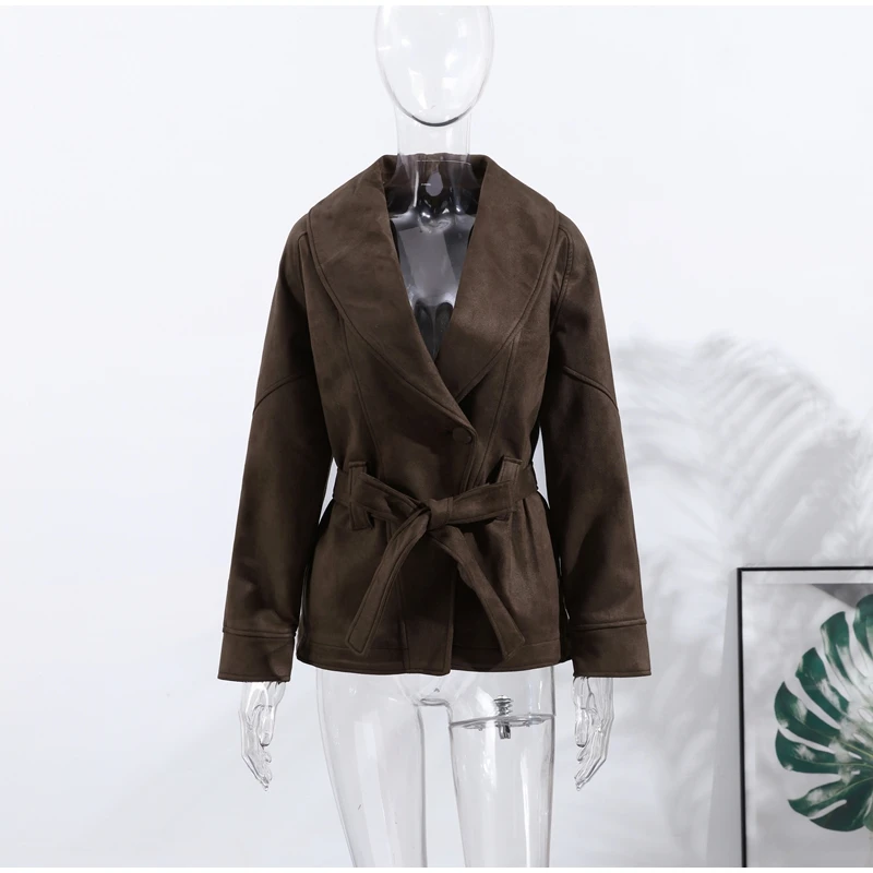 2025 Autumn New Belt Suede Jackets Women Lapel Long Sleeve One Button Lace Up Jacket Vintage Brown Loose Lady Outerwears Street