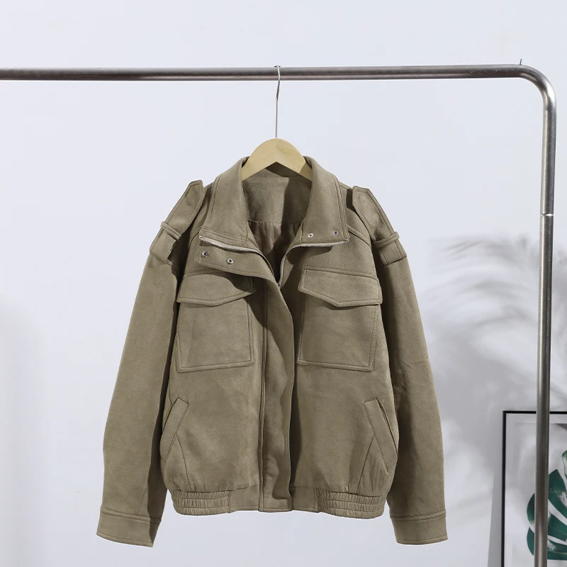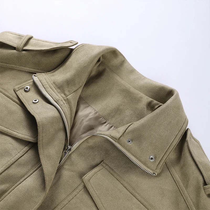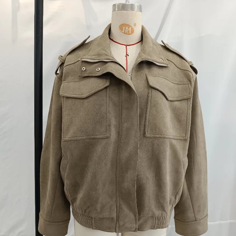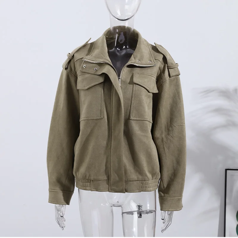 Fashion Suede Solid Coats Women Stand Neck Full Sleeve Zipper Pocket Jackets 2025 Autumn Winter New Female Moto Style Outerwear