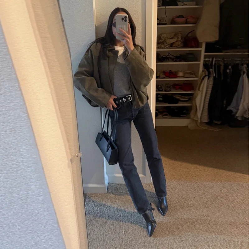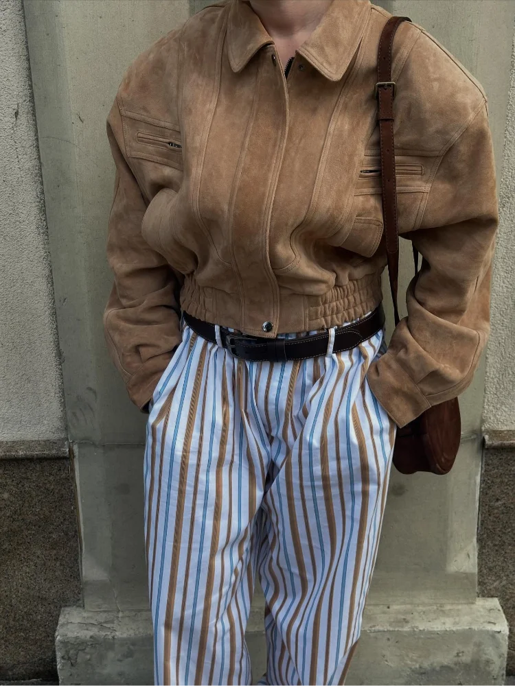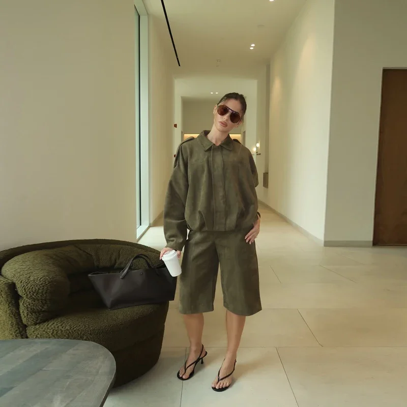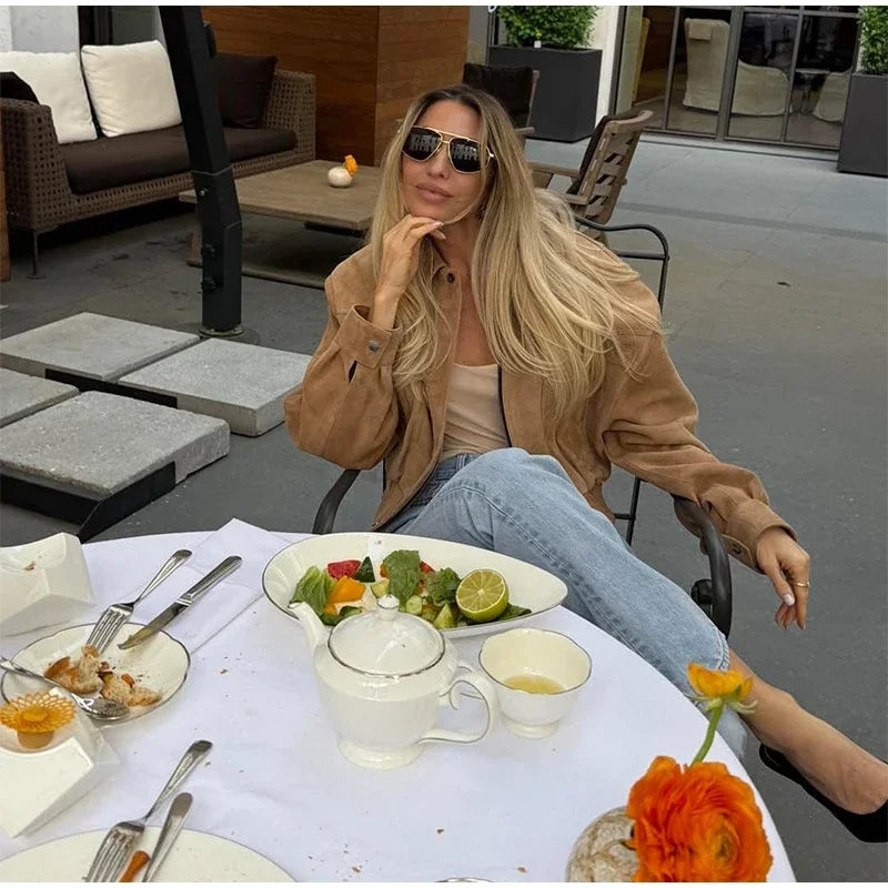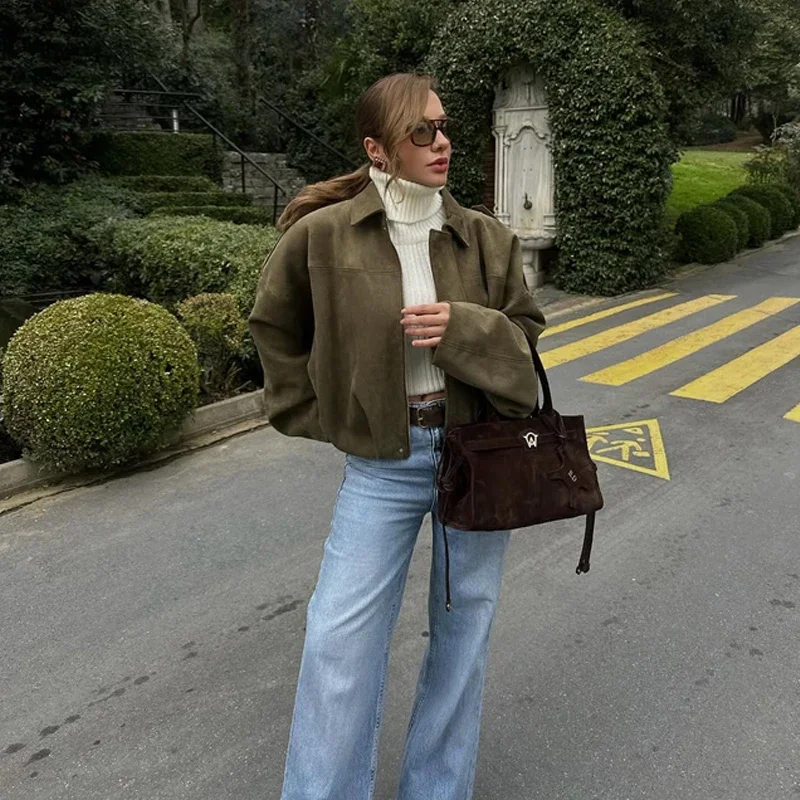 Solid Suede Zipper Short Jacket Women's Retro Full Sleeve Lapel Collar Pocket Elastic Waist Loose Overcoat Lady High Streetwear