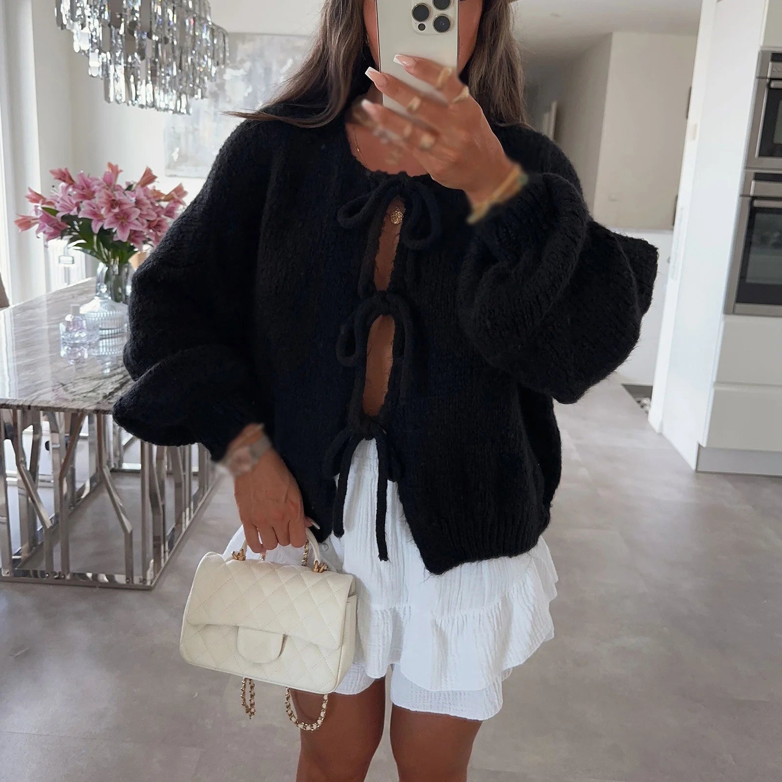 Knitwear Lace-Up Hollow Out Cardigan Top Women's Patchwork Fashion Autumn High Street Clothes Knit Y2k Bandage Cardigan